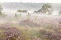 Heide landschap op een mistige ochtend in Nationaal Park Veluwezoom.