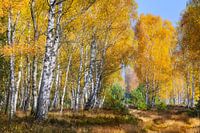Op een mooie oktoberdag liepen we door een heidelandschap in Brandenburg. Het gebladerte van de berkenbomen gloeit in de mooiste geeltinten.