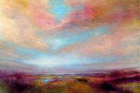 Een uitgestrekt landschap in warme kleuren. De horizon is ver weg, men ziet de hemel met gouden wolken. De stijl van schilderen is geabstraheerd, er is ruimte om het landschap verder vorm te geven in het oog van de toeschouwer. Associaties van vakantie, ontspanning, meditatie komen in me op.