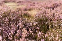 Een detailopname van een bloeiend heideveld in Gelderland.