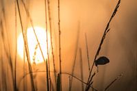 Een heideblauwtje bij de opkomende zon nog onder dauw in het hoge gras.