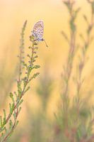 Een ochtend met een gouden randje. Ik was al vroeg in het veld en ontdekte deze mooie vlinder (heideblauwtje) wachtend op de warme zonnestralen. De zon brak mooi goudgeel door. Wat een feest!