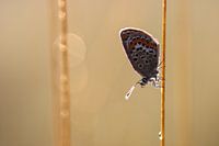 Heideblauwtje, vlinder, vlinders, vrouw, insect, insecten, macro, macrofotografie, macrofoto, bokeh, achtergrond, dauw, dauwdruppels, ochtend, zonsopgang, zonsopkomst, simpel, goud, bruin, druppels, tegenlicht