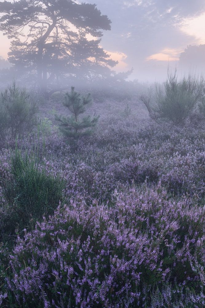 Om dit echt te laten gebeuren, moeten een paar dingen gunstig samenkomen: Rustige wind, hoge luchtvochtigheid, wolken in de lucht.... Daarom moet je het bij elke gelegenheid proberen - sta vroeg op en ga op zoek naar geschikte plekken terwijl het nog donker is. Vaak lukt het niet omdat sommige ingrediënten voor een goede heidefoto gewoon ontbreken - maar als de omstandigheden op een gegeven moment wel goed zijn, is zelfs vroeg opstaan snel vergeten.