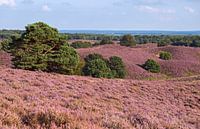 Heideblüte in der Veluwe, Blick über eine weite Hügellandschaft in der Veluwe, voll mit blühender Besenheide, dazwischen vereinzelte Kiefern , Sommer im National Park Veluwezoom, Niederlande.