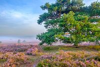 Bloeiende heideplanten (Calluna vulgaris) in een heidelandschap tijdens zonsopgang in de zomer met een dennenboom in natuurgebied de Veluwe op de Renderklippen in Gelderland, Nederland.
