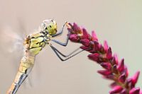 In eigen tuin zat deze bloedrode heidelibel op de bloem van de duizendknoop. Door een wat langzamer sluitertijd is mooi beweging in de vleugels te zien.