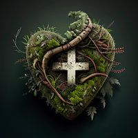 Sacred Heart of Nature presenteert een hartvormige compositie van weelderig groen gebladerte, verstrengelde takken en levendig mos, allemaal rondom een centraal wit kruis. De organische materialen en symbolische opstelling creëren een krachtig visueel statement van geloof, eenheid en de schoonheid van de schepping - ideaal voor…