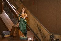 Een heilig beeldje bij de trap naar boven in een verlaten huis.