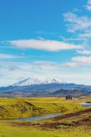 Panoramisch uitzicht over de besneeuwde bergen richting de Hekla vulkaan vanuit de Markarfljót vallei in IJsland tijdens de zomer met zacht wazig zonlicht dat de bergen in de verte raakt.