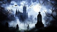 Een mysterieuze heks spreekt een duistere spreuk uit op een vervallen kerkhof, gehuld in dichte mist. De volle maan verlicht de gotische kerk op de achtergrond, terwijl vleermuizen door de onheilspellende nacht fladderen. Met opgeheven handen roept de heks duistere krachten op, die worden versterkt door de oude grafstenen en de sombere omgeving. Deze scène combineert mystiek en duisternis tot een fascinerend, bijna magisch moment.