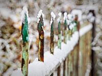 Winterstemming in het Limburgse Heuvelland waar de oude verf op een hekwerk van een weiland goed uitkomt in de vers gevallen sneeuw. Het gekozen perspectief en de beperkte dieptescherpte helpen om de focus te leggen op de afbladerende verf op de spijlen.