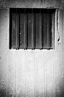 Afbeelding van een betonnen muur met verticale strepen en een venster met tralies. Zwart-wit foto Holga.