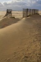 Twee hekken op strand in het stuifzand met dreigende wolkenluchten aan de horizon. Verticale foto.