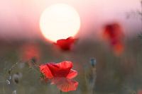 Zonsondergang in een veld met klaprozen. Het lijkt alsof een bijzonder mooie bloesem de zon absorbeert als een schaal en voorkomt dat ze ondergaat