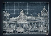 Grafiek in de stijl van een blauwdruk van de Heldenplatz met de kasteelpoort, het ruiterstandbeeld van aartshertog Karl en de koepel van het Museum voor Kunstgeschiedenis in Wenen, Oostenrijk.