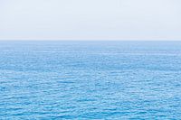Op de foto zie je het serene, blauwe water van de Middellandse Zee aan de kust van Apulië, in het zuiden van Italië. Het rustige oppervlak van de zee weerspiegelt de helderheid van de lichtblauwe lucht erboven. De horizon scheidt het kalme water van de lucht en benadrukt de uitgestrektheid van de zee. Er zijn geen andere objecten zichtbaar, wat de eenvoud en rust van dit maritieme landschap benadrukt.