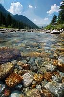 De foto toont een kristalheldere rivier die zachtjes over kleurrijke, glinsterende stenen stroomt. De diepgroene oevers worden omlijst door majestueuze bergen, terwijl heldere, pluizige wolken de helderblauwe lucht sieren. De combinatie van water en licht creëert een betoverende, rustgevende sfeer die je uitnodigt om op onderzoek uit te gaan.