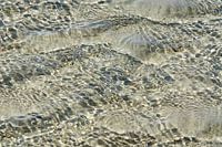 Helder ondiep zoutwater op het strand van Vlieland waar de wind overheen blaast geeft een mooie reflectie van het zonlicht.