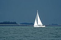Helder witte zeilboot steekt af tegen donkerblauwe lucht boven de Oosterschelde