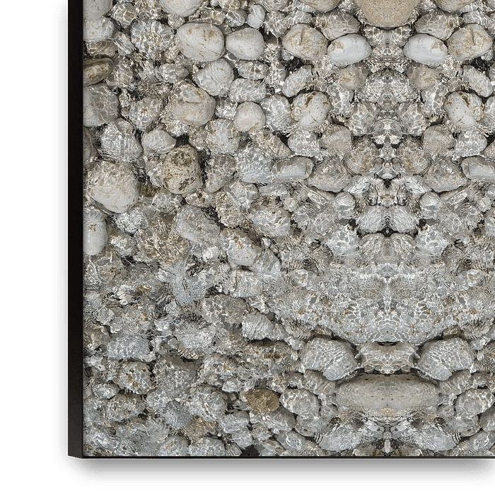 Helder zeewater ontmoet symmetrie en stenen gevormd door de kracht van het water. Deze gespiegelde compositie van gebroken zonlicht, de zachte beweging van stromend water en witte stenen is opgedragen aan de prachtige stranden van de Costa Blanca. Op een mooie zomerdag aan de Middellandse Zeekust.