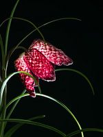 Studiofoto van de bloem van een dambordbloem, Fritillaria meleagris, tegen een zwarte achtergrond.