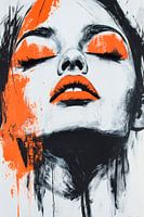 Een fascinerend samenspel van gedurfde oranje accenten en zachte zwart-wit contrasten belichaamt pure emotie en passie. De uitdrukking op het gezicht straalt zowel kracht als gratie uit, waardoor het kunstwerk de perfecte blikvanger is voor een moderne woonkamer. Het verlevendigt de kamer en zet aan tot nadenken.