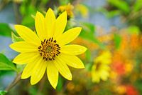 Een foto van een soort zonnebloem in mijn tuin. Het frisse geel steekt mooi af tegen de herfstkleuren in de achtergrond.
