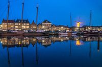Stadsgezicht met haven en windmolen De Hoop in Hellevoetsluis bij schemering, Zuid-Holland, Nederland | stadsgezicht met haven en windmolen De Hoop in Hellevoetsluis bij schemering, Zuid-Holland, Nederland