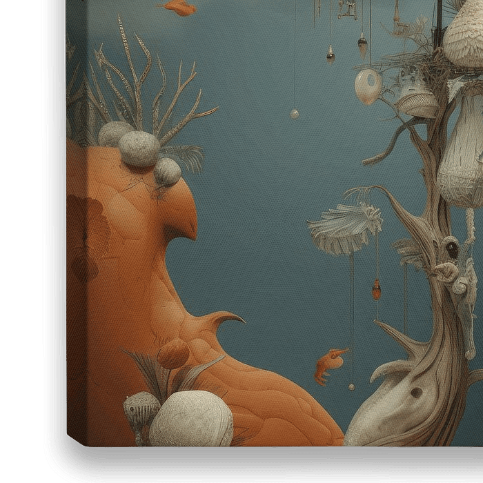 Breng een vleugje surrealisme in jouw interieur met onze muurprint van deze betoverende surrealistische hert. Oranje en blauw pastel tinten.