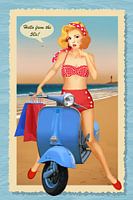 Sexy pin-up meisje in de retro-stijl van de jaren 50 op een cultescooter op het strand.