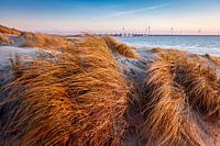 Robuust helmgras in de duinen bij Westenschouwen en Burgh - Haamstede op Schouwen Duiveland in Zeeland. Als de zomer voorbij is en de winter nadert kleurt het helmgras naar goud/geel tot bijna oranje/bruin door de ondergaande zon...