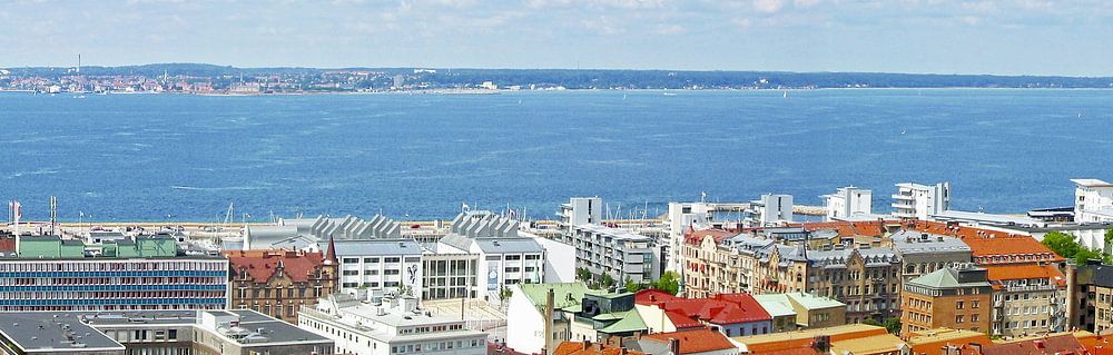 Panorama van Helsingborg (Zweden), Öresund en Helsingör (Denemarken).