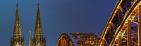 Een beeld van harmonie en contrast rijst op tussen de hemel en de Rijn. Links de filigraan torens van de Dom van Keulen, met hun gotische torenspitsen die als stenen gebeden de avondlucht in steken. Rechts de machtige bogen van de Hohenzollern brug, overgoten met warm LED licht dat het staal laat gloeien als een gouden lint.