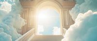 Trappen kronkelen omhoog naar een majestueuze poort omgeven door stralend licht en die leidt naar de hemelse uitgestrektheid. De zachte wolken geven het beeld een dromerige sfeer die uitnodigt om te dromen. Perfect voor de slaapkamer, het creëert een rustgevende oase van inspiratie en ontspanning.