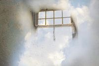 Over ‘Hemels uitzicht - oud raam met blauwe hemel en wolken’ van Marly De Kok