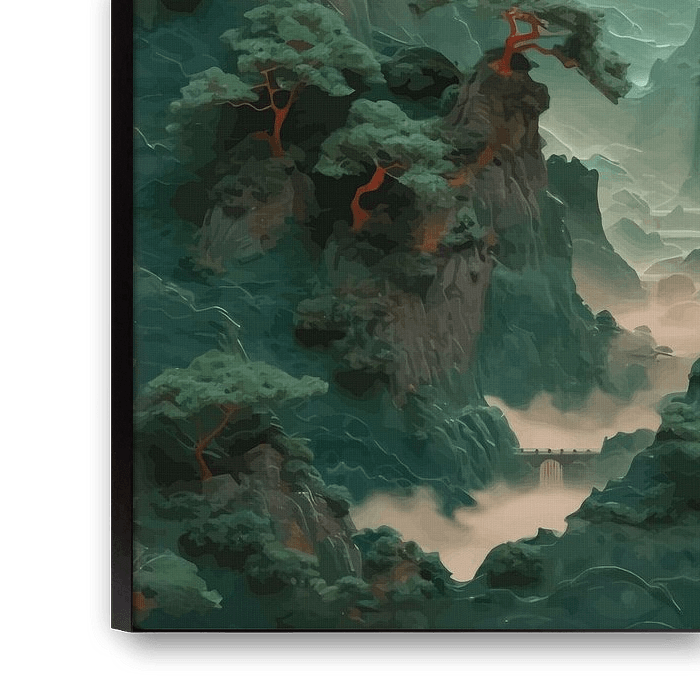 Stijg op naar een wereld van rust met dit adembenemende landschap. Mistige bergen strekken zich uit zover het oog reikt, met als hoogtepunt een opvallende rode zon die een etherische gloed over het tafereel werpt.
