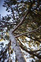 Nederlandse naaldboom in de duinen gefotografeerd bij Parnassia tijdens zonsopkomst. Gouden uur, zonsopkomst. Gouden bomen, zonlicht, tilt-shift effect, abstracte onscherpte. Mooi tegenlicht in het bos middenin de nederlandse natuur. Een landschapsfoto van een mooi boom die reikt naar de hemel. Scherpte verloop.