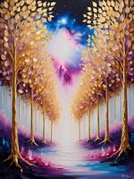 Dit fascinerende kunstwerk toont een sereen pad omzoomd met gouden bomen, dat leidt naar een levendig hemels portaal. De bomen glinsteren met een warme, metalen gloed, die prachtig contrasteert met het diepe blauw en paars van het omringende landschap. De poort aan het einde van het pad barst van de kosmische energie, met een nevel van…