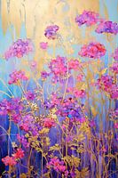 Hemelse Hortensia Bloei - Tegen een hemelsblauwe achtergrond, aangevuld met gouden accenten die lijken op neerdalende zonnestralen, komen florale vormen tot bloei. Rose en paarse bloemenschermen, mogelijk hortensia's, zorgen voor een levendige en speelse visuele ervaring, waarin natuur en een vleugje abstractie samensmelten. De…