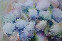 In Hemelse Hortensia’s komen kleur, licht en stilte op poëtische wijze samen. Deze aquarel ademt een serene, bijna dromerige sfeer waarin de bloemen lijken op te lossen in een nevel van pastel en zachtheid.
