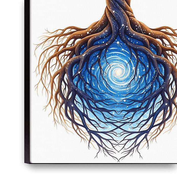 Mystieke illustratie van een kosmische levensboom die het universum boven en het sterrenstelsel onder verbindt. De gloeiende wortels en takken verstrengelen zich met sterrenbeelden en sterrenlicht en symboliseren de eenheid tussen hemel en aarde. Perfect voor meditatieruimtes, spirituele interieurs en dromerige wanddecoratie.