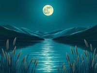 Dit suggestieve kunstwerk vangt de diepe rust van een maanverlichte nacht, waar een lichtgevende volle maan een glinsterend zilveren pad werpt over het kalme water van een uitgestrekt meer. Majestueuze bergen, afgetekend tegen de diep indigo hemel, omringen de serene uitgestrektheid en versterken het gevoel van vredige afzondering. Op de voorgrond staat delicaat riet, hun zachte wiegen duiden op een zacht, onzichtbaar briesje dat een organisch, aardend element toevoegt aan de etherische scène. De rijke blauwe en groene tinten, onderbroken door de gouden gloed van de maan's, creëren een betoverend palet dat uitnodigt tot contemplatie en rust. Dit stuk is een perfecte weergave van de nachtelijke schoonheid van de natuur en biedt een venster op een wereld van rust en introspectie.