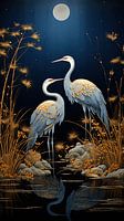 Dit schilderij vangt het betoverende zicht van twee kraanvogels, elegant gepositioneerd te midden van een maanverlicht bos. Badend in het zachte licht van de maan stralen hun silhouetten gratie en rust uit, en creëren ze een serene en mystieke scène te midden van de rustige bossen.