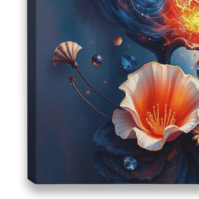 In dit adembenemende werk onthult een kosmische schelp een universum van kleur en energie. Stralende bloemen en planeten dansen rond een explosie van licht, terwijl een vogel met sierlijke vleugels het tafereel met leven vult. De samensmelting van elementen creëert een betoverend en meeslepend schouwspel.
