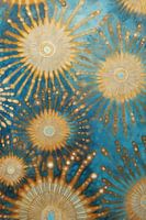 Dit werk vangt de pracht van een sterrenhemel op een heldere nacht, met stralende sterren die uitbarsten in een symfonie van licht. De achtergrond in diepe blauwtinten contrasteert prachtig met de warme, gouden stralen van de sterren, die een gevoel van oneindigheid en mysterie oproepen. De subtiele patronen en gedetailleerde stralen geven diepte en beweging aan het beeld, waardoor het een betoverende aanvulling vormt op elke ruimte. Ideaal voor wie houdt van de magie van de nacht en de schoonheid van het universum.