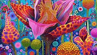Hemelse Tuin" is een betoverend kunstwerk dat de kijker onderdompelt in een surrealistisch landschap waar flora lijkt te gedijen in een buitenaardse sfeer. De levendige kleuren en ingewikkelde patronen creëren een harmonieuze mix van natuur en fantasie, die het gevoel oproept van een wandeling door een kosmische tuin waar elk blad en bloemblaadje pulseert van leven en energie