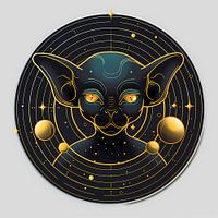 Dit fascinerende kunstwerk toont een mystiek katachtig figuur met grote oren en stralende, glanzende ogen tegen een hypnotiserende kosmische achtergrond van rondcirkelende planeten en verspreide sterren. Het verfijnde kleurenpalet van zwart en goud zorgt voor een dramatisch contrast en geeft het werk verfijning en tijdloze elegantie. De…