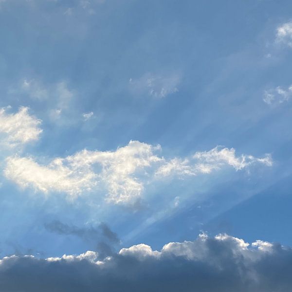 Een schaduwspel in de lucht. Deze foto doet denken aan een omgekeerde paraplu of onderrok die zwevend in de lucht in beweging komt. Lichte witte strepen stijgen omhoog en brengen de lichtblauwe lucht tot leven. Onderaan de foto is een schaduwspel te zien van grijsblauwe wolken, omrand door prachtige zachte witte wolken op de…