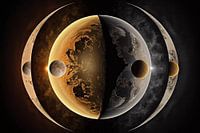Hemelse reflecties: The cosmic dance" is een betoverende compositie geïnspireerd door de ruimte, met een reeks overlappende planetaire lichamen in een evenwichtig samenspel van licht en schaduw. De gespiegelde opstelling creëert een gevoel van harmonie en beweging doordat lichtgevende hoogtepunten contrasteren met diepe, schaduwrijke gebieden. Dit kunstwerk vangt het mysterie en de elegantie van de kosmos, waardoor het een indrukwekkend statement is voor moderne, astronomische of meditatieve ruimtes.